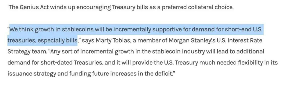 甚至摩根士丹利认为稳定币是一个增量投资机会。值得注意的是,这些代币的增长可能会提振对短期美国国债的需求,从而使财 政 部在弥补赤字和管理现金流方面拥有更大的灵活性。这些代币能够实现大额结算,例如银行间转账或贸易结算,几乎可以即时清算,其运作方式类似于数字现金账户。