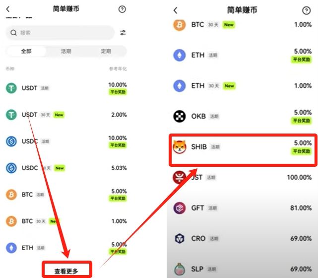 我们点击“查看更多”,可以看到这里还有一些狗狗币、屎币,统称山寨币,给的收益虽然很高,但是币价不稳定,拿不准新手就没有必要入局了,除非你真的很懂。