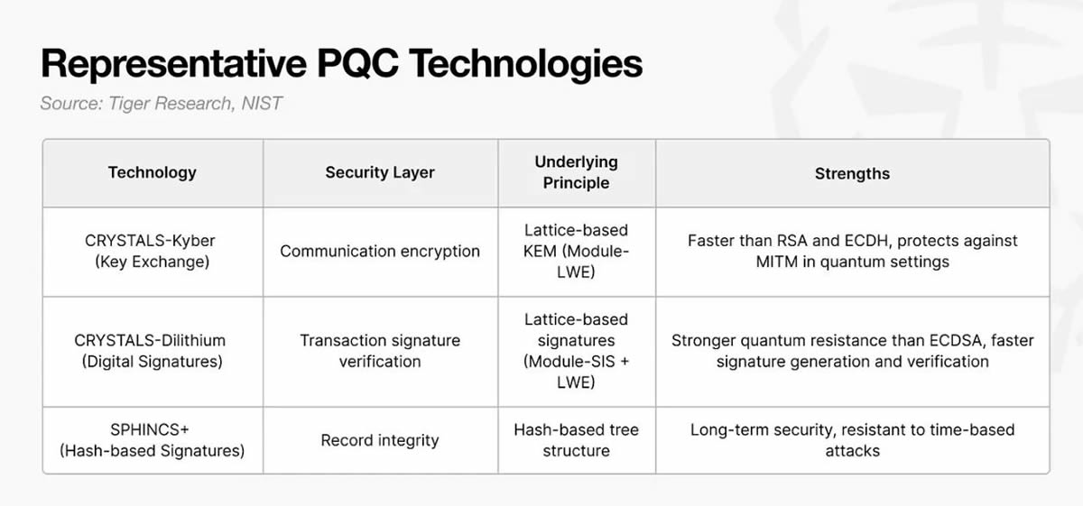 - 后量子密码学在三个安全层面提供针对量子攻击的保护:通信加密、交易签名和数据存续。