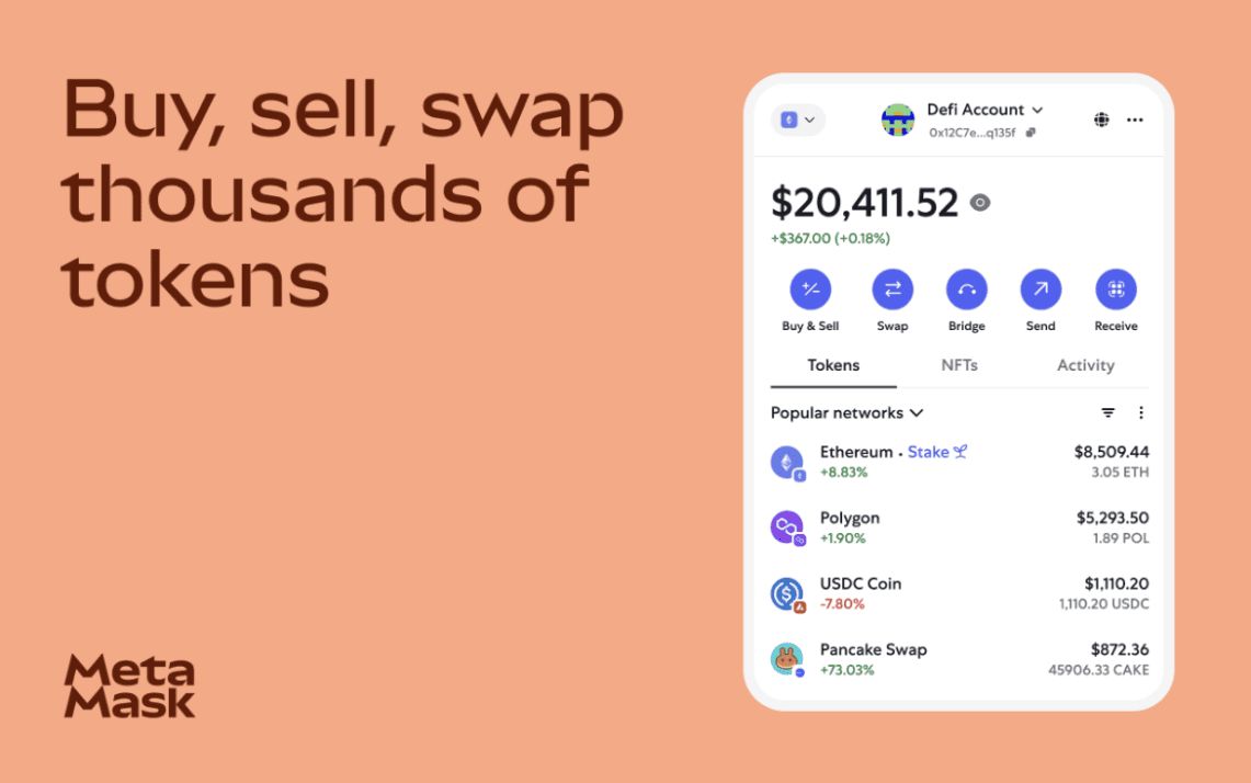 MetaMask 主要在以太坊和其他 EVM 兼容链上运行,为用户提供跨多个网络(如 Binance Smart Chain、Avalanche 和 Polygon)管理资产的能力。它还支持自定义 RPC 网络,允许手动添加任何基于 EVM 的链。内置交换引擎聚合来自多个去中心化交易所的流动性,为代币交换提供竞争性汇率。用户可以与数百种 ERC-20 代币交互,并利用即时桥接进行跨链活动。