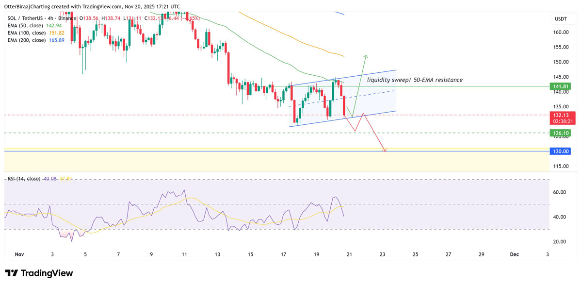 周四,Solana短暂超越比特币(BTC)、以太坊(ETH)和瑞波币(XRP),在一小时和四小时图上形成更高的高点和低点结构。但其反弹很快被50-EMA的强大阻力所限制,价格回落至132美元。