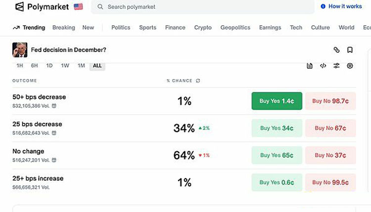 据CME“美联储观察”:美联储12月降息25个基点的概率为39.6%,维持利率不变的概率为60.4%。美联储到明年1月累计降息25个基点的概率为50.2%,维持利率不变的概率为29.7%,累计降息50个基点的概率为20.2%。此外,Polymarket 数据显示,“美联储 12 月降息 25 个基点”的概率跌至34%,维持利率不变的概率升至64%。