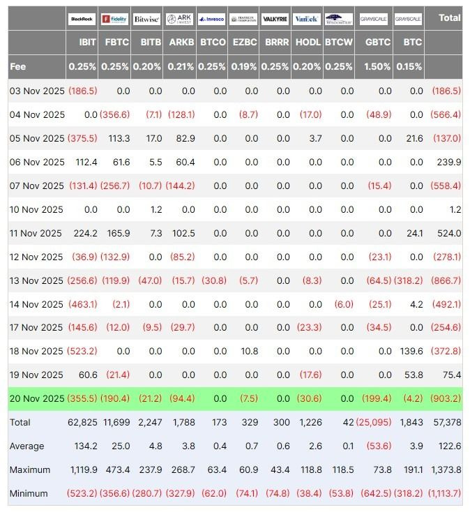 与此同时,机构投资者开始撤离。曾被誉为主要看涨催化剂的美国现货比特币ETF,近几周遭遇了创纪录的资金流出。仅贝莱德旗下的iShares比特币信托基金(IBIT)在11月份就蒸发了超过24亿美元,占美国所有比特币基金近38亿美元赎回总额的绝大部分。11月18日,比特币价格跌至七个月低点的同一天,ETF也经历了有史以来最大的单日净流出——超过9亿美元。
