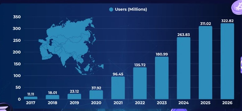 根据Statista Market Insights 的预测,2025 年该地区的加密货币市场收入将达到 288 亿美元,预计年增长率为 6.49%,到 2026 年总收入将达到 307 亿美元。预计到 2026 年,亚洲的用户群将达到 3.2282 亿人,2025 年的渗透率为 9.93%,2026 年将增至 10.21%。