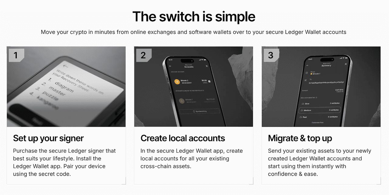 Ledger 需要更多前期设置:您必须通过选择 PIN 码来初始化设备,记下恢复短语,并通过 Ledger Live 安装应用进程。对于每笔交易,您都必须在硬件设备上实体确认操作,这会增加摩擦,但大幅提高了安全性。这种设置过程可能感觉不太方便,但它能防止许多与在线暴露相关的风险。