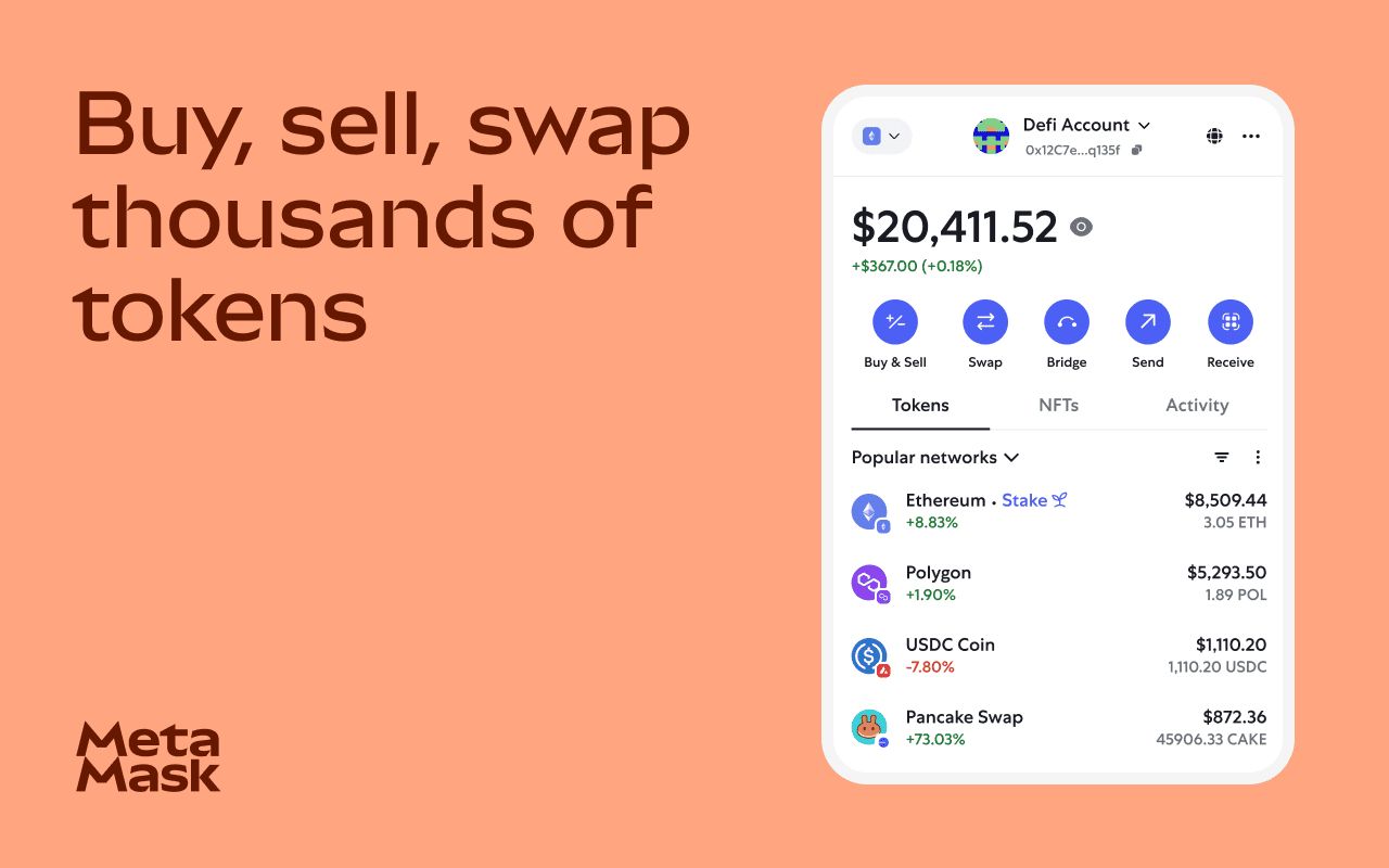 MetaMask 支持以太坊和任何通过自订 RPC 添加的 EVM 兼容链,例如 Polygon、BNB Chain、Arbitrum、Optimism 和 Avalanche,并允许您通过其内置的 DEX 聚合器直接兑换代币或使用第三方协议桥接资产。