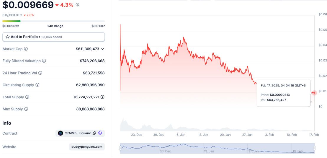 NFT领域的市场波动和激烈竞争导致Pudgy Penguins的价值下降。截至2025年2月17日,$PENGU代币的价格约为0.0097美元。