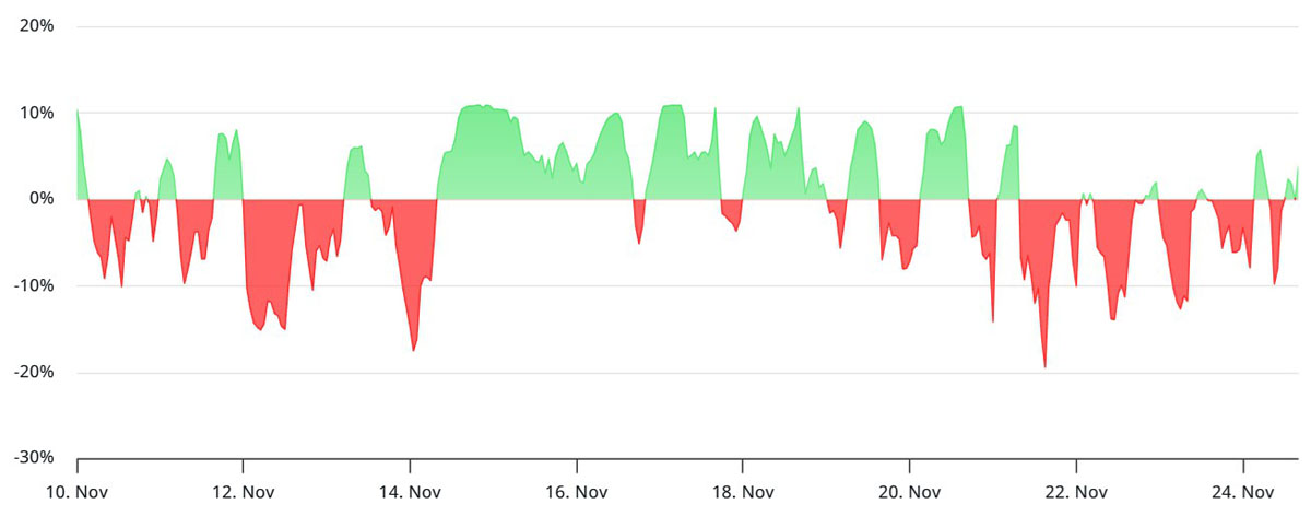 自周五以来,SOL永续期货的看跌杠杆需求一直存在,因为资金费率转为负值,这意味着交易员正在支付以维持从进一步价格下跌中获益的头寸。在中性条件下,该指标通常在6%到12%之间,以弥补机会成本。