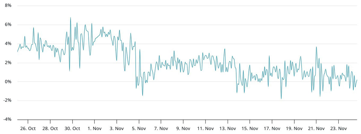 索拉拉的疲弱反映出风险偏好的整体下滑,但其他因素也可能导致其相较主要山寨币的表现不佳。美国成功推出瑞波交易型基金(ETF)后,对机构资金的竞争加剧,且与其他加密货币相关的产品(包括莱特币与Chainlink)预计将陆续推出。
