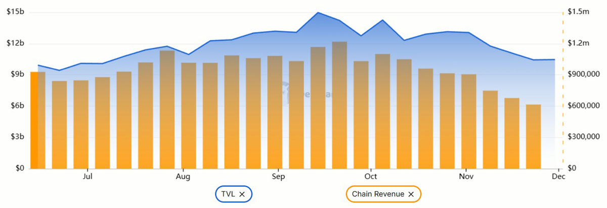 Solana网络TVL(左)与每周链收入(右),美元。来源:DefiLlama