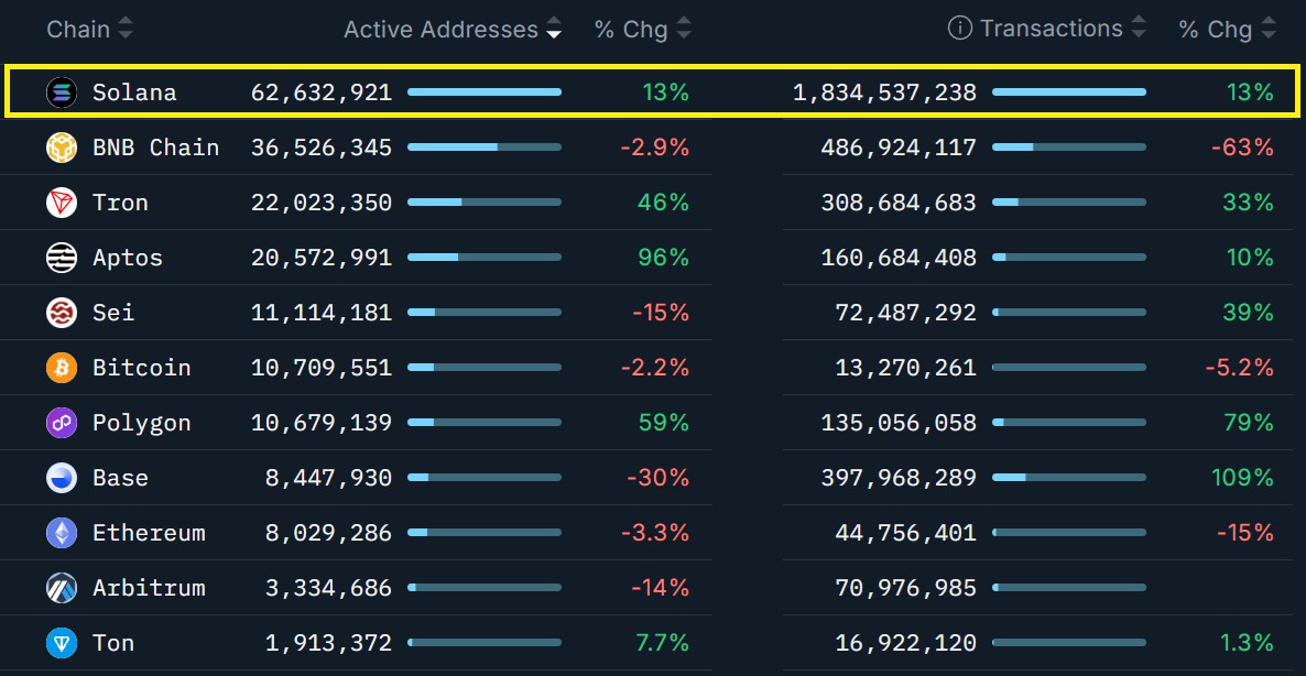 Solana在活跃地址和交易数量上仍然是明显的领导者,远远领先于排名第二的BNB链。更重要的是,Nansen数据显示Solana的活动增加了13%,而其主要竞争对手以太坊则下降了15%。这些数据可能有助于增强SOL投资者的信心,但它们本身并不是持续牛市的催化剂。