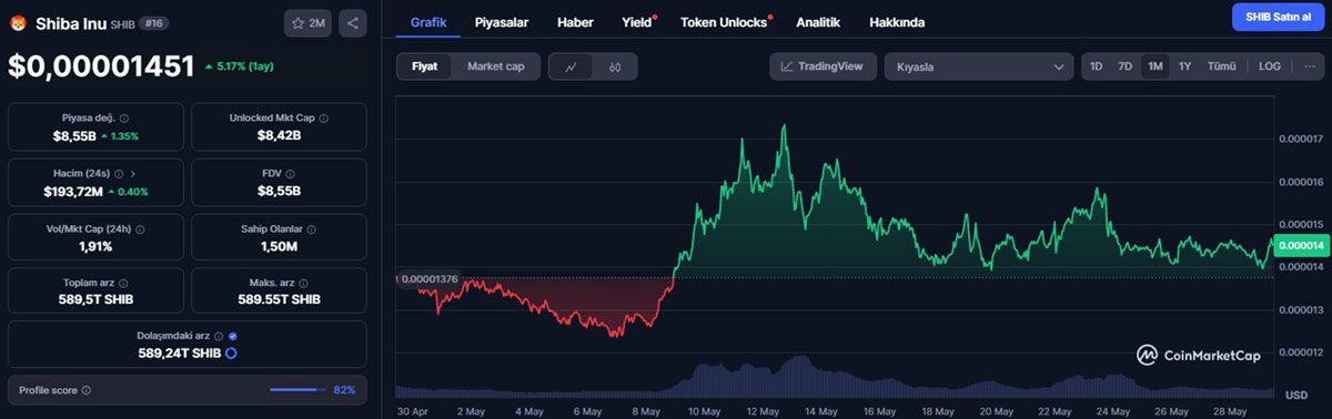 到2025年中期,我们预计$SHIB的市值约为85亿美元。从2024年12月下旬到2025年5月下旬,其股价从0.00002879美元跌至0.00001445美元。