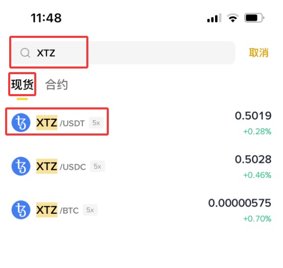 3、输入【XTZ】,这时下拉会显示【现货】【XTZ/ USDT】,点击【XTZ/ USDT】。(作为新手,不建议做合约,所以这里就不演示合约购买方式了。)