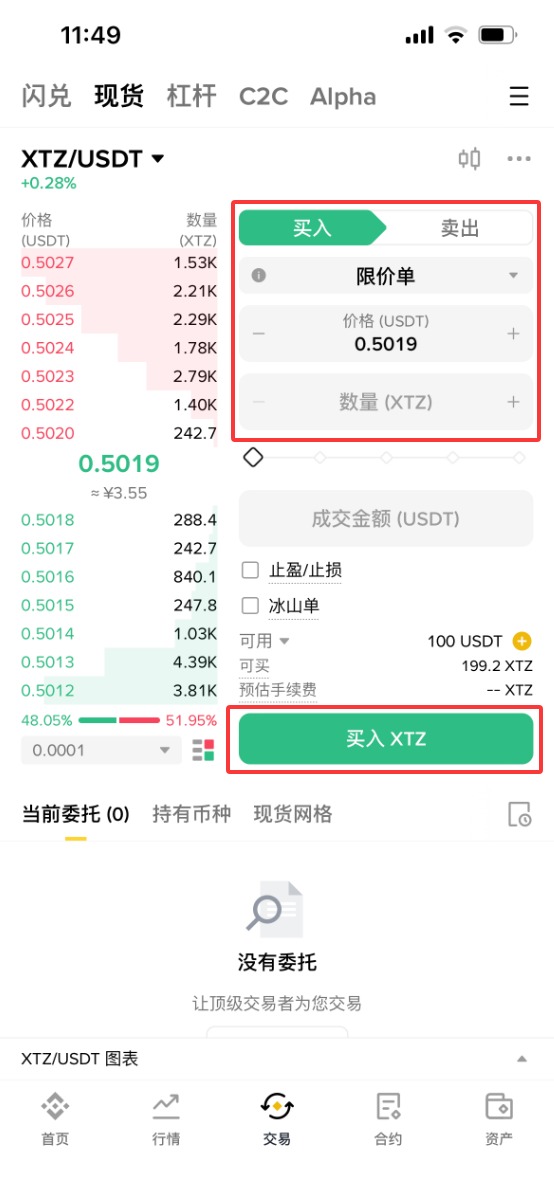 5、依次选择【限价单】-购买【价格】-购买【数量】-【成交数量】,设置好之后,点击【买入XTZ】。