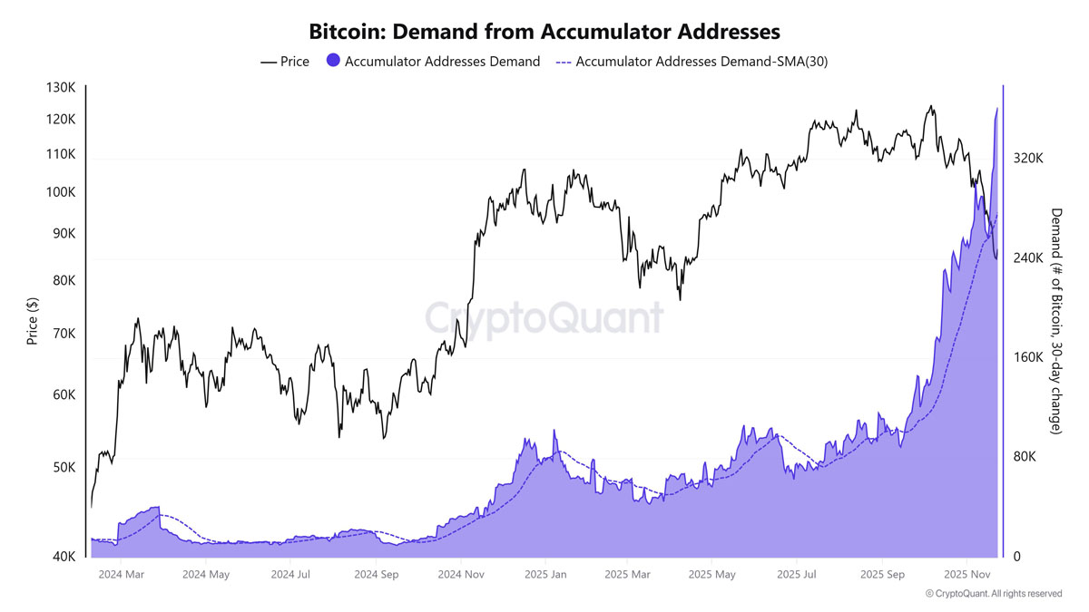 - 累积地址需求触及创纪录的365,000枚比特币,暗示长期信心回归。