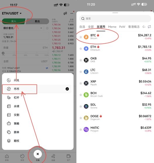 点击下方的【交易】按钮,选择“币币”交易(也就是欧易现货交易的意思)。