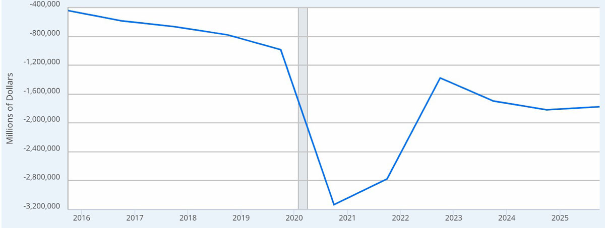 美国联 邦 政府盈余或赤字,美元。来源: Federal Reserve