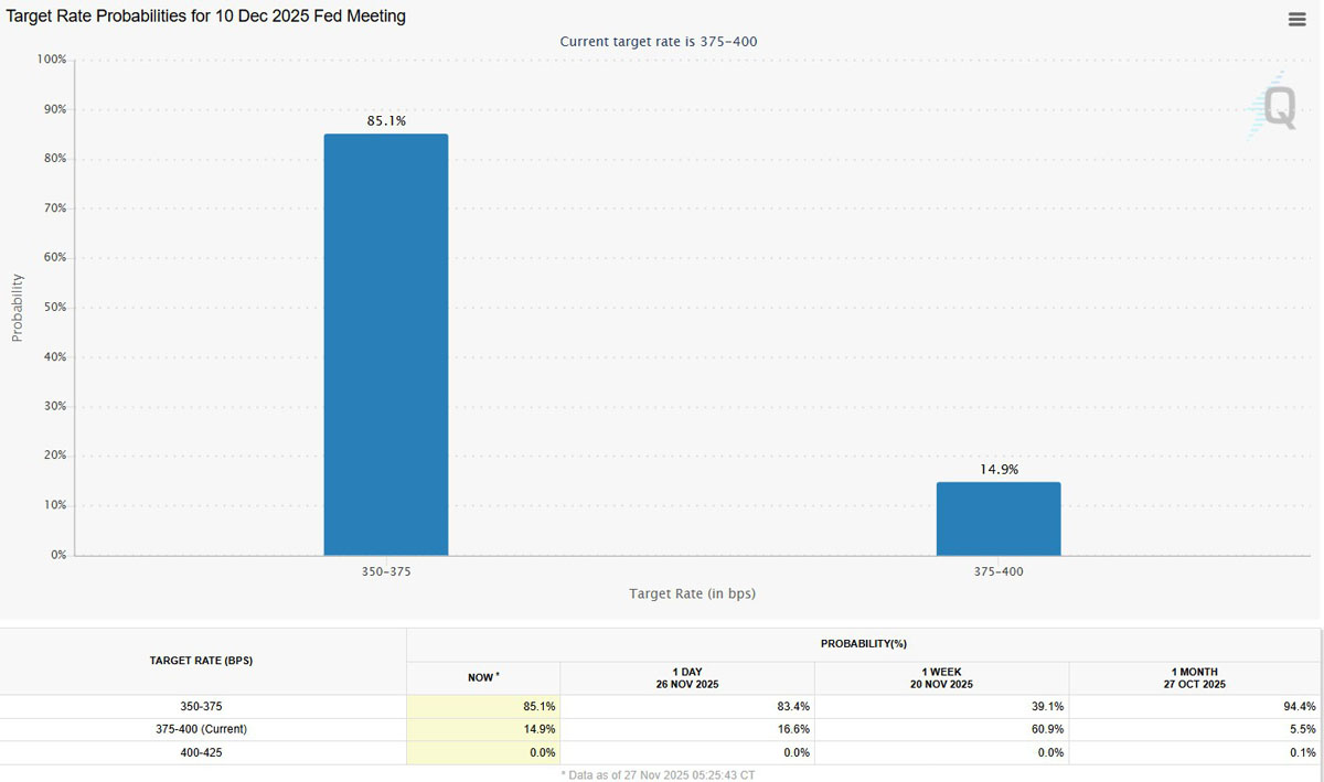 比特币的复苏紧随美国联邦储备委员会12月10日会议的利率削减预期大幅上升,一周内概率增加了46%。