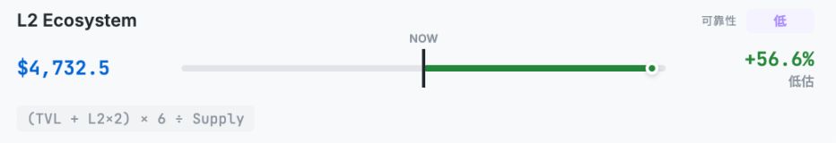 与第一种估值模型类似,只是这个模型加上的所有 L2 的 TVL 并因为 L2 对以太坊的消耗给了 2 倍的加权,计算方法为 (TVL + L2_TVL×2) × 6 ÷ Supply,得出的价格是 4732.5,较目前价格有 56.6% 的上涨空间。