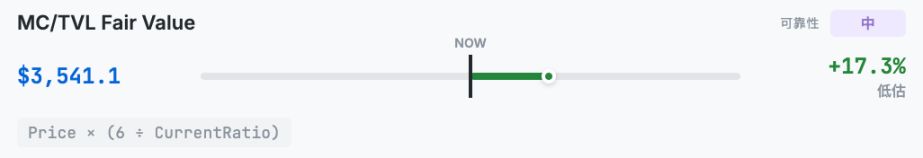 该模型本质是一种均值回归的模型,计算方式就是认定市值与 TVL 比值的历史平均水平为 6 倍,超过即为高估,不够则为低估,公式为 Price × (6 ÷ Current Ratio),得出的价格是 3541.1 美元,较目前价格有 17.3% 的上涨空间。
