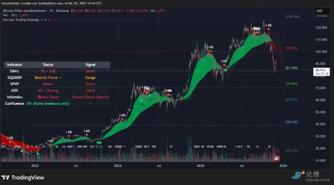 - · 而当前价格所在的 8.3 万区间,正是过去几个月的关键中枢点位,一旦跌破,下一个大级别支撑要到 7 万美元附近。