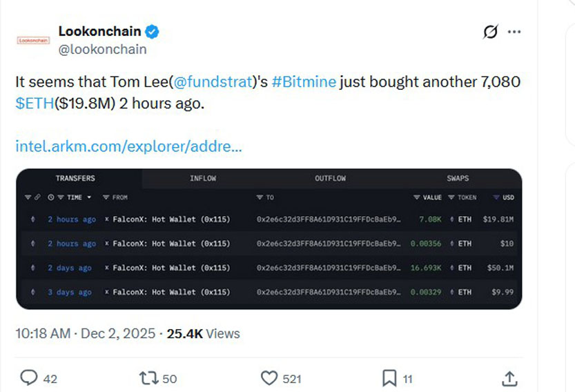 根据加密货币数据分析平台Lookonchain的X帖子,Bitmine周一以约1980万美元购买了7080枚以太币(ETH)。