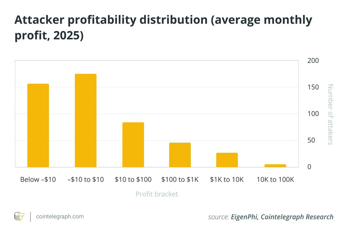 每次三明治攻击的平均利润仍然非常低,略高于3美元。只有六个攻击者创造了超过10,000美元的总利润,这表明在这个利基市场中,获得一致回报的途径变得多么狭窄。2025年,大约三分之一的活跃三明治机器人在盈亏平衡 (-10美元至10美元) 左右运行,而大约30% 的人录得净亏损。由于对有限机会的激烈竞争、计算错误的滑点和天然气成本,机器人往往会蒙受损失。边距太薄,无法吸收这些错误。