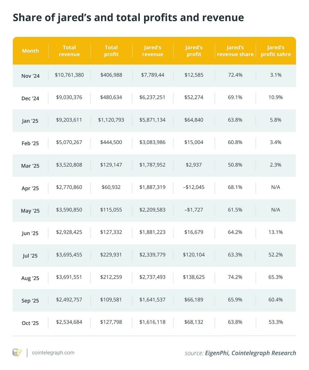 数据表明,贾里德的策略是迄今为止最赚钱的。它优先考虑数量,并抓住大多数可用的三明治机会,包括较小的机会,这通常只带来几美分的利润。在2025年的大部分时间里,燃气成本相对于每次攻击的收入保持较低水平,这使得该模型比以前更加可行。然而,贾里德有时仍然会蒙受损失。2025年4月,其利润率为负20%,折算成亏损约1.2万美元。