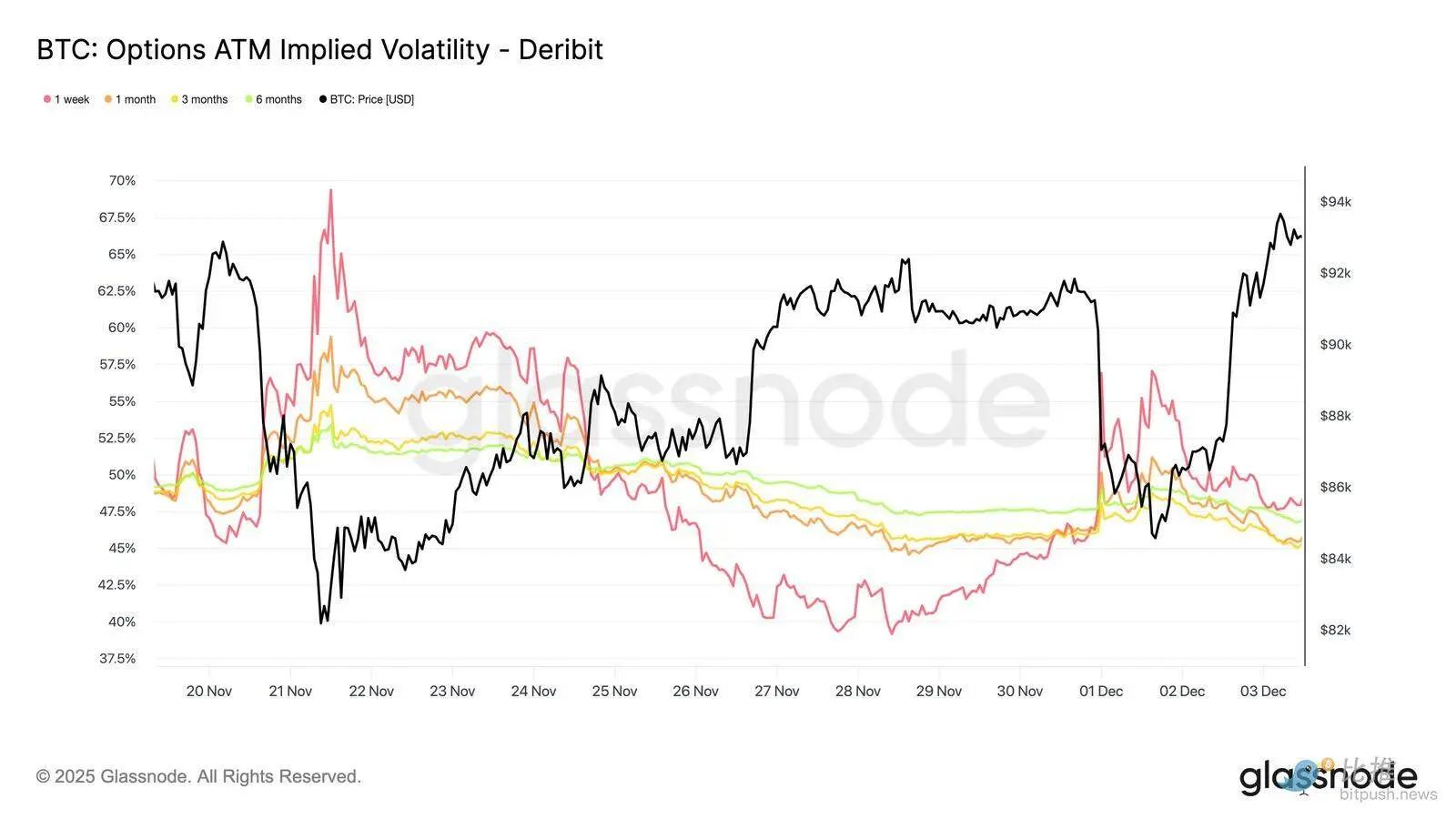 转到期权市场,隐含波动率(IV)为了解交易者如何为未来不确定性定价提供了一个清晰的窗口。作为一个起点,跟踪隐含波动率是有用的,因为它反映了市场对未来价格变动的预期。隐含波动率在上周读数高企后已重置走低。价格难以突破 92K 的阻力位,且反弹缺乏后续动力,促使波动率卖方重新介入,将隐含波动率全线推低: