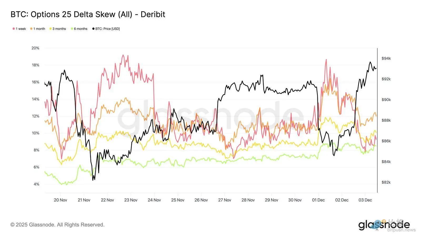 短期偏度在周一(由日本债券叙事驱动的跌至 84.5K 期间)从 18.6% 移动到反弹时的 8.4%。