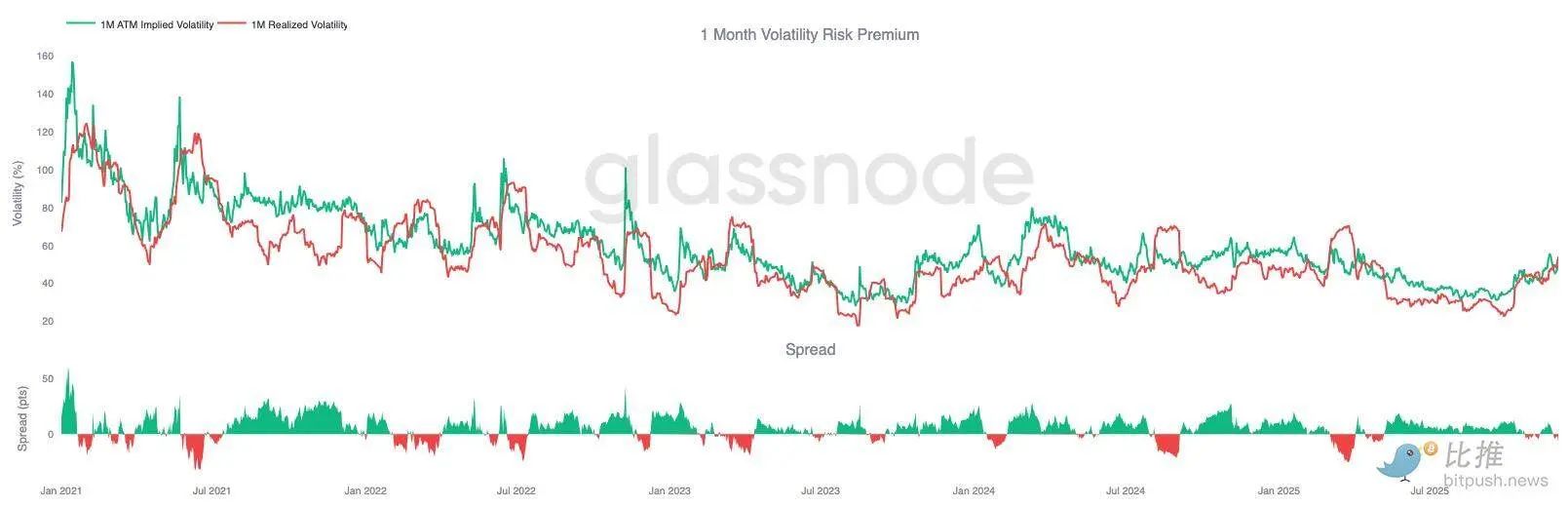 当我们把隐含波动率的重置与本周双向的剧烈波动结合起来看时,结果是负的波动率风险溢价。波动率风险溢价通常是正的,因为交易者要求对波动率飙升的风险进行补偿。没有这种溢价,做空波动率的交易者就无法将其承担的风险货币化。
