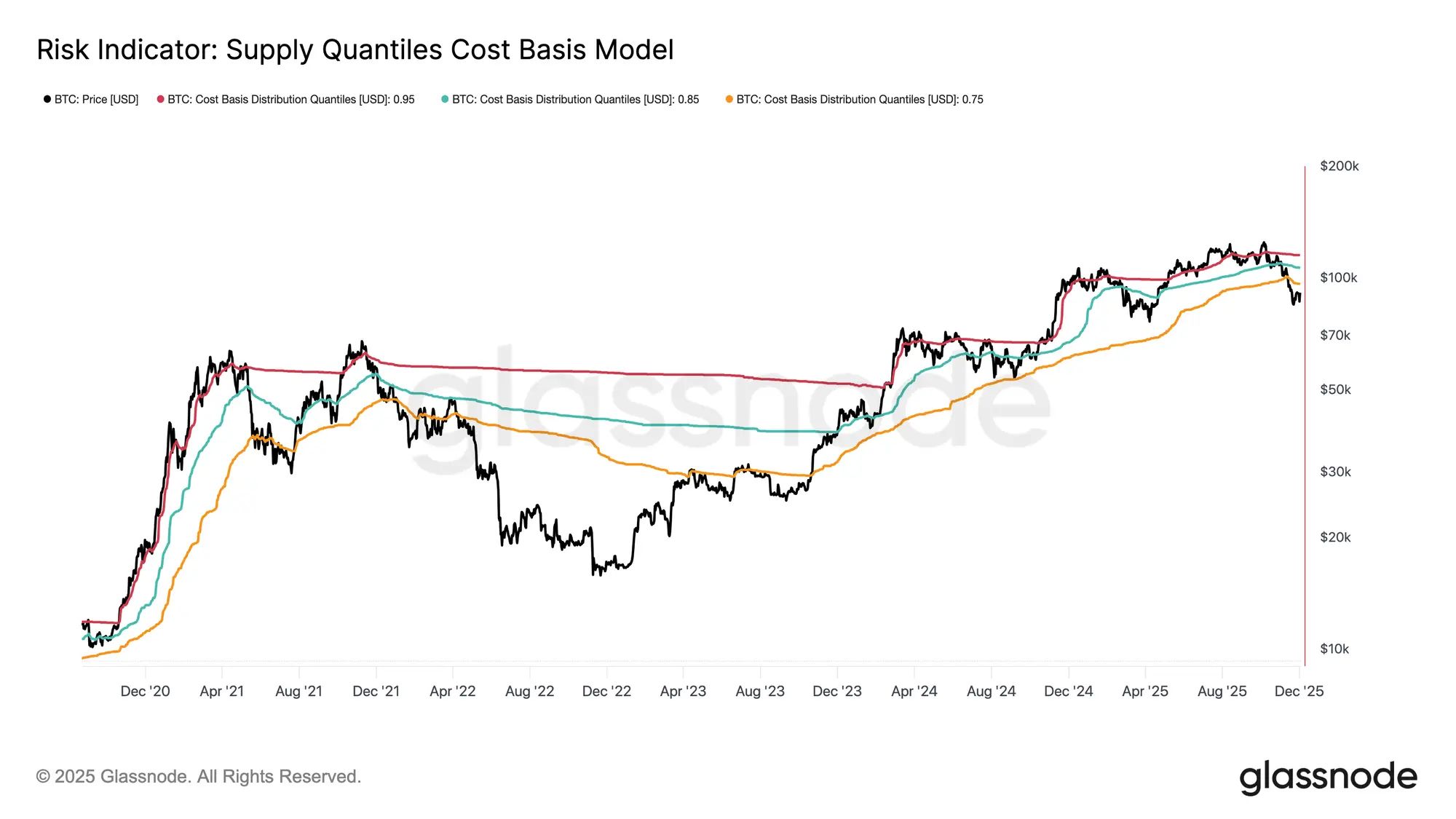 使用供应分位数成本基础模型(Supply Quantiles Cost Basis Model)(该模型跟踪顶级买家持有的供应集群的成本基础),这种相似性变得更加清晰。自 11 月中旬以来,现货价格已跌破 0.75 分位数,目前在 96.1K 美元附近交易,使得超过 25% 的供应处于亏损状态。