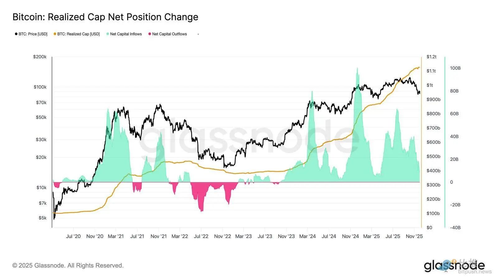 这种资本动能可以通过已实现市值净变化(Net Change in Realized Cap)来衡量,目前它处于每月 +86.9 亿美元的水平——远低于 2025 年 7 月峰值的 643 亿美元 / 月,但仍是正值。