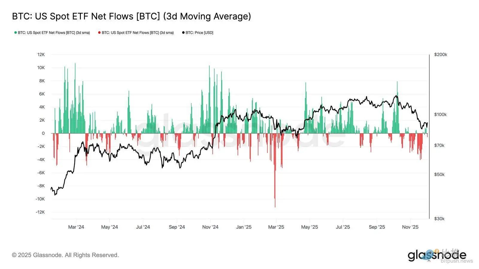 转到现货市场,美国比特币 ETF 的净流入显着恶化,其 3 日平均值在整个 11 月坚定地滑入了负值区域。这标志着打破了今年早些时候支撑价格的持续流入状态,反映出新资本配置的降温。