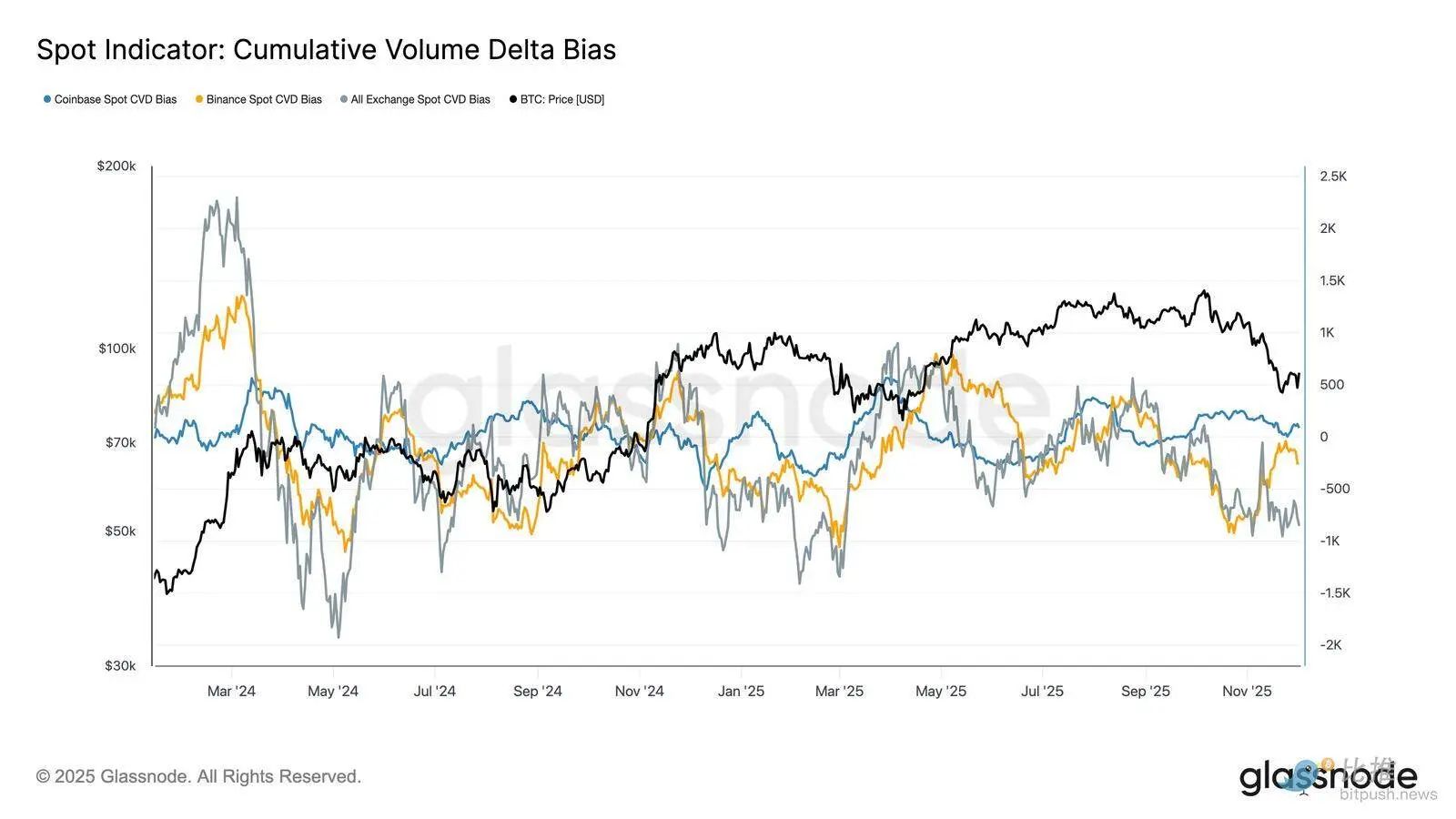 随着 ETF 资金流和现货 CVD 偏向转为防御性,市场现在依赖于更薄弱的需求基础,使价格更容易受到持续下跌和宏观驱动的波动性的影响。