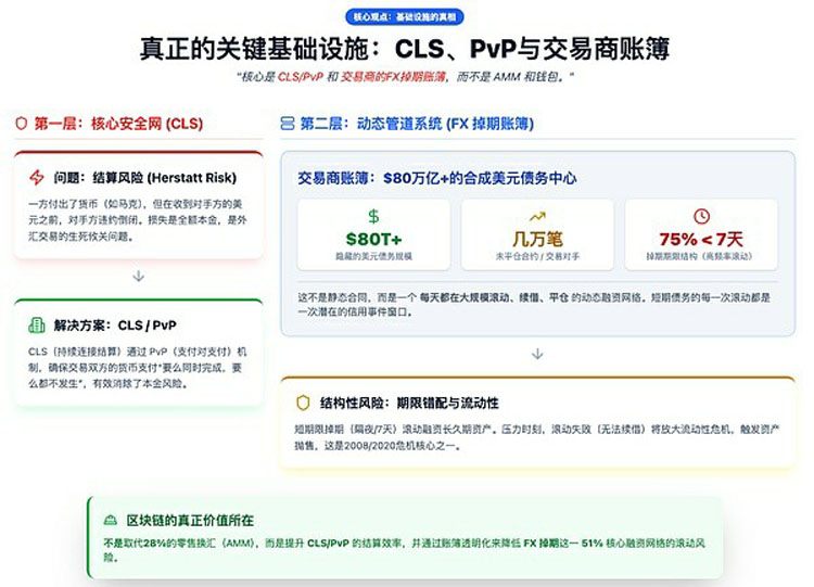 "关键基础设施是CLS/PvP和交易商的FX掉期账簿,其中隐藏着80万亿美元以上的美元债务,而不是AMM和钱包。"