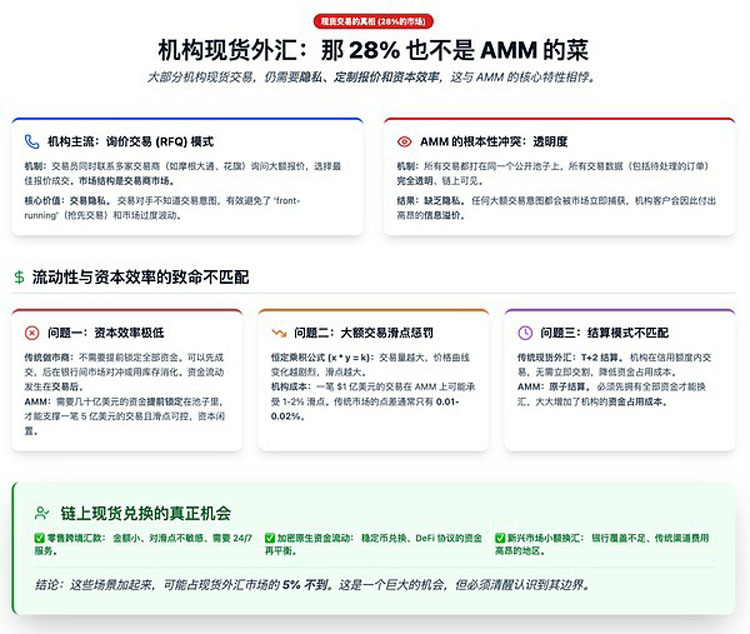 写到这里,可能有读者会问:好吧,FX掉期那51%确实不适合AMM,但剩下28%的现货交易呢?这不就是实打实的"换汇"吗?USDC换EURC,不正是AMM擅长的事?