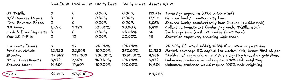 基于上述假设,对于总资产约为 1,812 亿美元 的泰达币,其风险加权资产(RWAs)可能介于 约 623 亿美元至 1,753 亿美元 之间,具体取决于对其商品组合的处理方式。
