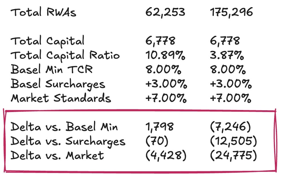 现在,我们可以将最后一块拼图补上,从相对风险加权资产(RWAs)的角度来审视泰达币的股本或超额储备。换句话说,我们需要计算泰达币的总资本充足率(Total Capital Ratio, TCR),并将其与监管最低要求和市场惯例进行比较。这一步分析不可避免地带有一定的主观性。因此,我的目标并不是对泰达币是否拥有足够的资本以让 $USDT 持有人感到安心给出最终结论,而是提供一个框架,帮助读者将这一问题分解为易于理解的部分,并在缺乏正式审慎监管框架的情况下形成自己的评估。