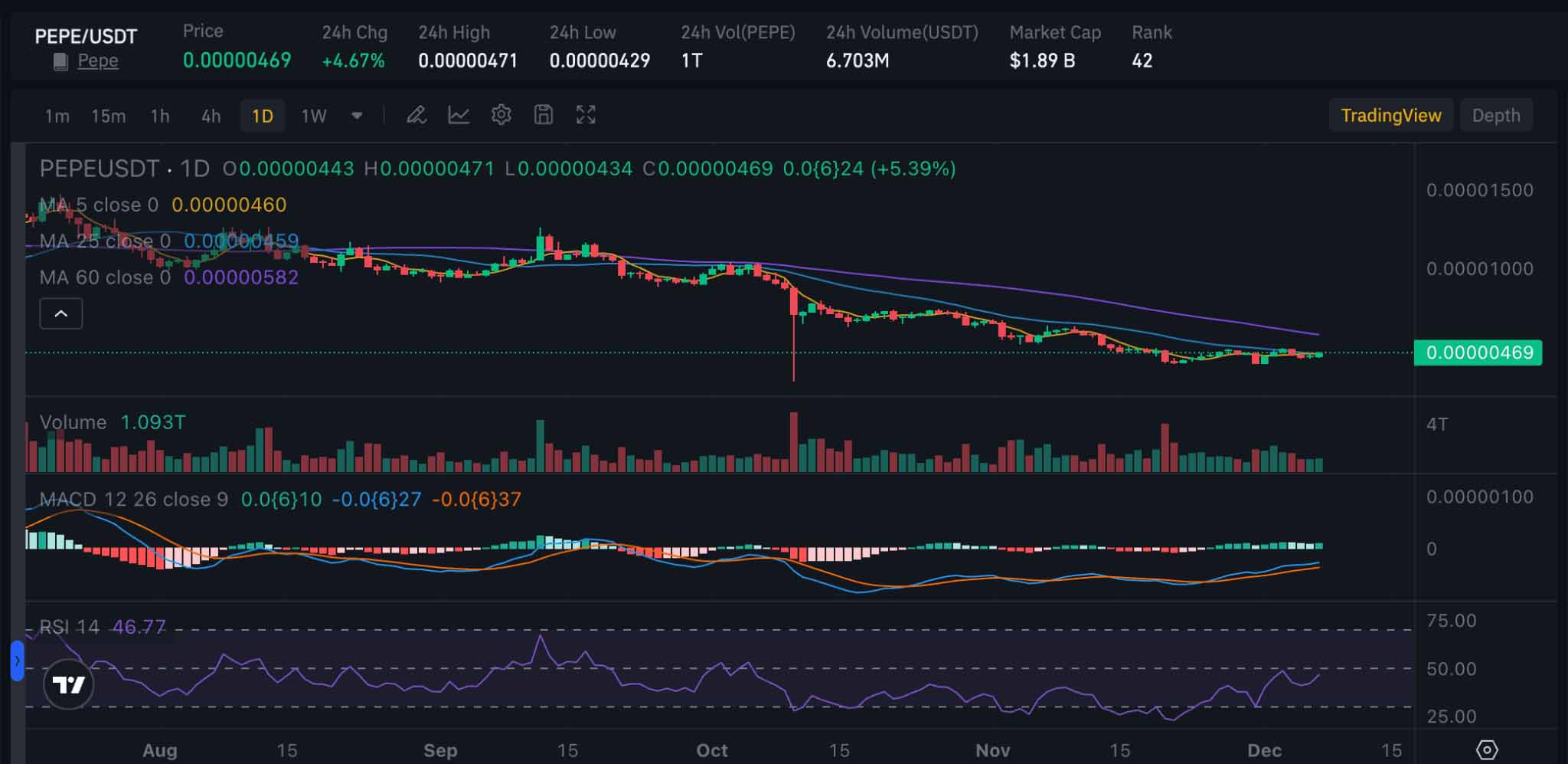 Pepe 交易在 alrededor$0.0000046484截至2025年12月初,市值接近19.6亿美元。