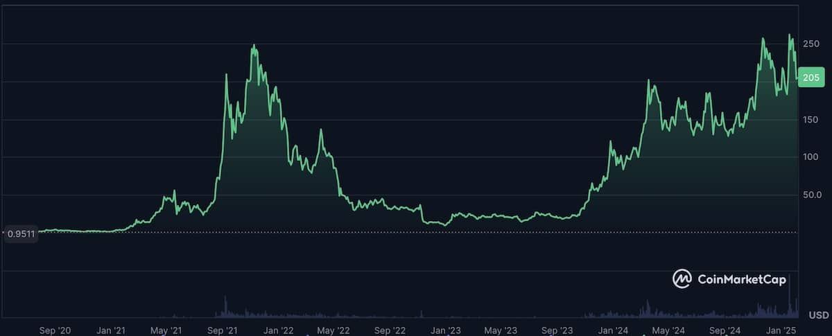 2024年11月,该代币价格短暂触及263美元的峰值,但随后略有回落,截至2025年2月,交易价格约为200美元。这种价格波动受到整个加密货币市场趋势、监管环境变化以及Solana自身技术更新的影响。
