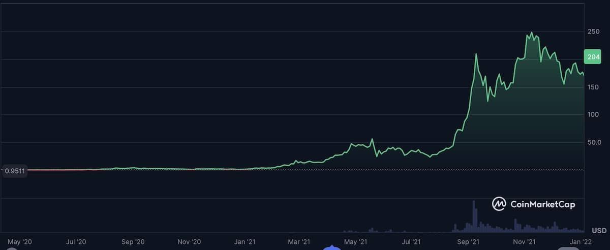 Solana (SOL) 是一种 ICO 加密货币,于 2020 年 3 月推出了主网测试版,最初交易价格约为 1 美元。然而,在 2021 年,随着整个加密货币市场的蓬勃发展,其价格大幅上涨。