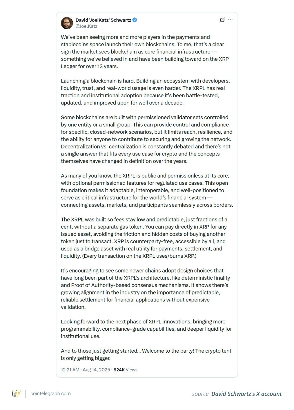- David Schwartz 持相反立场,认为 XRPL 的可靠性和稳定性比追求高吞吐量链更有价值。