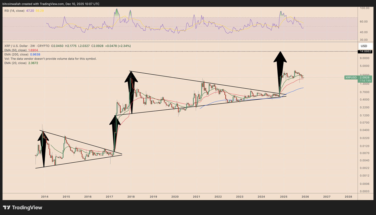 如果XRP确认突破旗形阻力,结构的预测移动也指向14-15美元区域,这与三角形的目标一致。