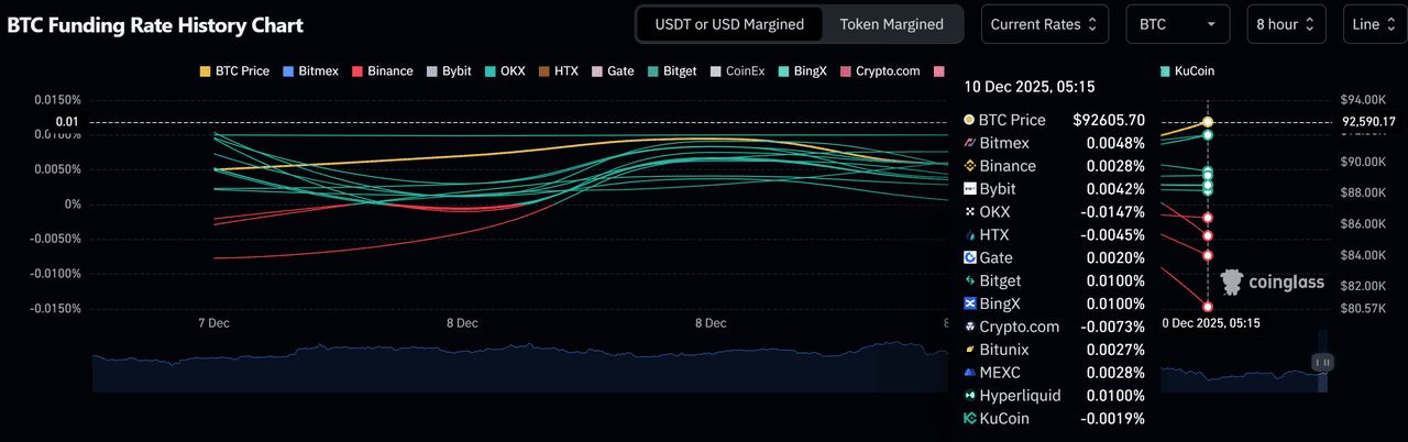 在比特币资金费率图表上,比特币在 92,600 美元附近交易,而资金费率则跌向或低于零。负资金费率意味着交易者正在支付费用以持有空头头寸。同时,未平仓合约保持高位——这是空头头寸拥挤的早期迹象。