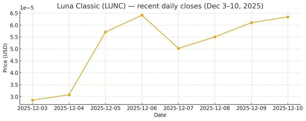 LUNC 价格图表(2025 年 12 月 3 日至 10 日)(数据来自 CoinGecko / LUNCMetrics 每日快照)