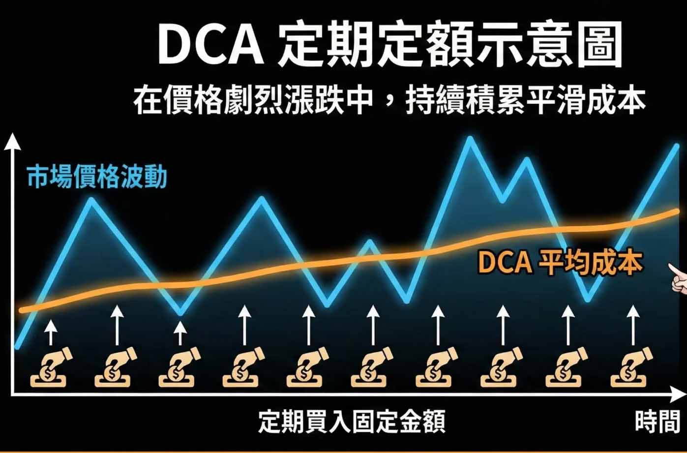 DCA(Dollar-Cost Averaging)平均成本法是一种投资策略,也叫做「定期定额」、「定投」,DCA可以通过定期买进来平滑投资的市场波动和购买成本。