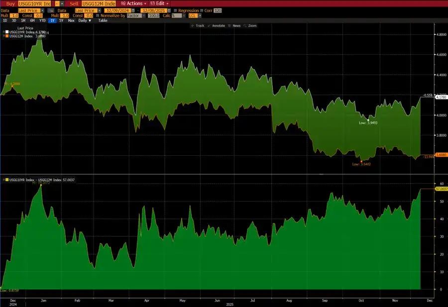 对普通投资者来说,这个指标可能有点陌生,但它其实是市场判断「谁在控制长期利率」最直接的信号。最近,12 个月美债与 10 年期国债的利差再次接近阶段高点,而这一轮上升并不是因为经济向好,也不是通胀抬头,而是市场在重新评估:未来决定长期利率的,可能不是美联储,而是财政部。