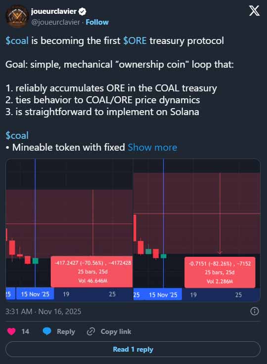 2025 年 11 月 15 日,ORE 宣布与 $COAL 创建合作伙伴关系,这为通缩机制增添了另一层次。要理解这种合作关系,需要先了解 Coal 究竟是什么。