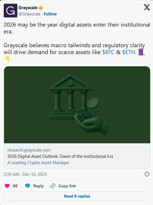 Grayscale的2026年数字资产展望将明年视为「机构时代的曙光」。该公司预计:
